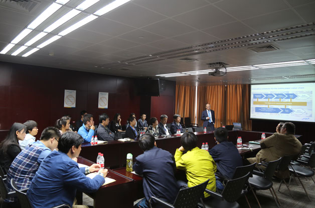 Frank Miletzky博士首先介紹了PTS的發(fā)展現(xiàn)狀、運(yùn)營(yíng)模式、業(yè)務(wù)領(lǐng)域和行業(yè)服務(wù)能力,然后結(jié)合PTS的研究領(lǐng)域,重點(diǎn)介紹了PTS在工業(yè)4.0、汽車(chē)和飛機(jī)用紙基減重材料、包裝用紙板、纖維功能化改性、先進(jìn)分析檢測(cè)設(shè)備等方面的一些新的研究成果。報(bào)告結(jié)束后,雙方就感興趣的學(xué)術(shù)問(wèn)題進(jìn)行了積極交流。